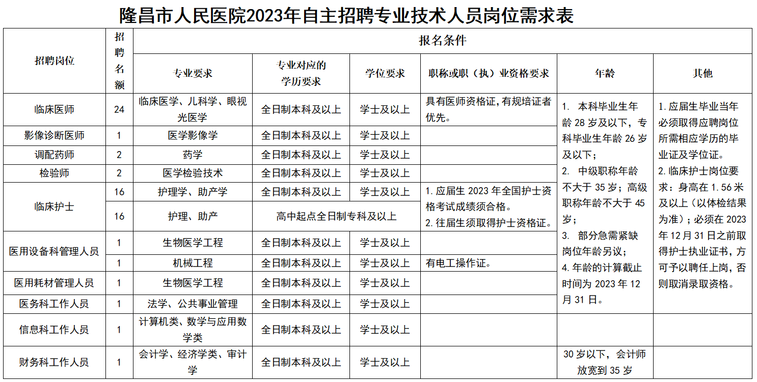 詳見附件《隆昌市人民醫(yī)院2023年自主招聘專業(yè)技術(shù)人員崗位需求表》。