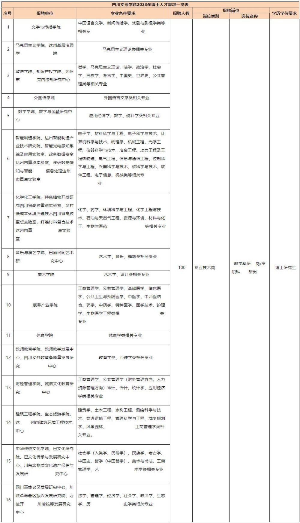 本次招聘名額為100名,具體崗位、專業(yè)、名額見《四川文理學(xué)院2023年考核招聘博士需求一覽表》(附件1)。